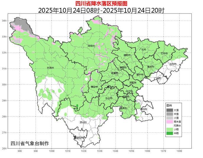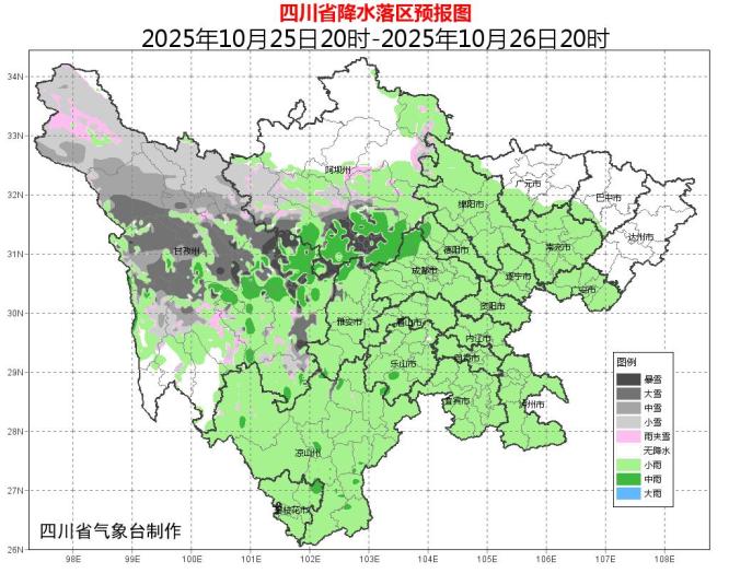 24日晚上到25日白天,盆地各市陰天有小雨,局部中雨;川西高原陰天間多云有陣雪(雨),局部中到大雪,個別暴雪;攀西地區(qū)陰天間多云有陣雨或小雨,局部中雨。
