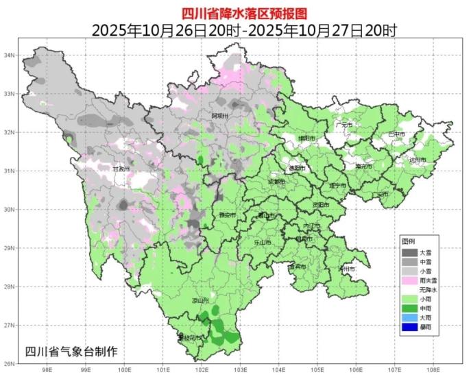 25日晚上到26日白天,盆地大部陰天間多云有小雨,局部中雨;川西高原陰天間多云有陣雪(雨),部分地方有中到大雪(雨),局部暴雪;攀西地區(qū)陰天間多云有陣雨或小雨,局部中雨。