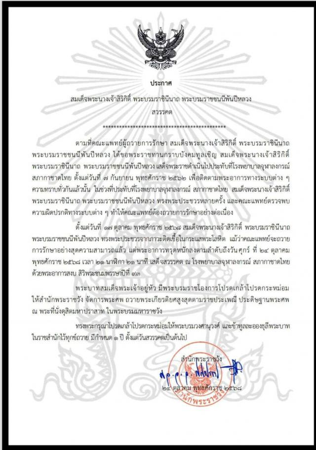 自2025年10月17日起,太后因血液循環(huán)系統(tǒng)感染(菌血癥)病情嚴重。盡管醫(yī)護團隊全力救治,但其病情仍持續(xù)惡化。至2025年10月24日21時21分,詩麗吉太后在朱拉隆功紀念醫(yī)院安詳辭世,享年93歲。