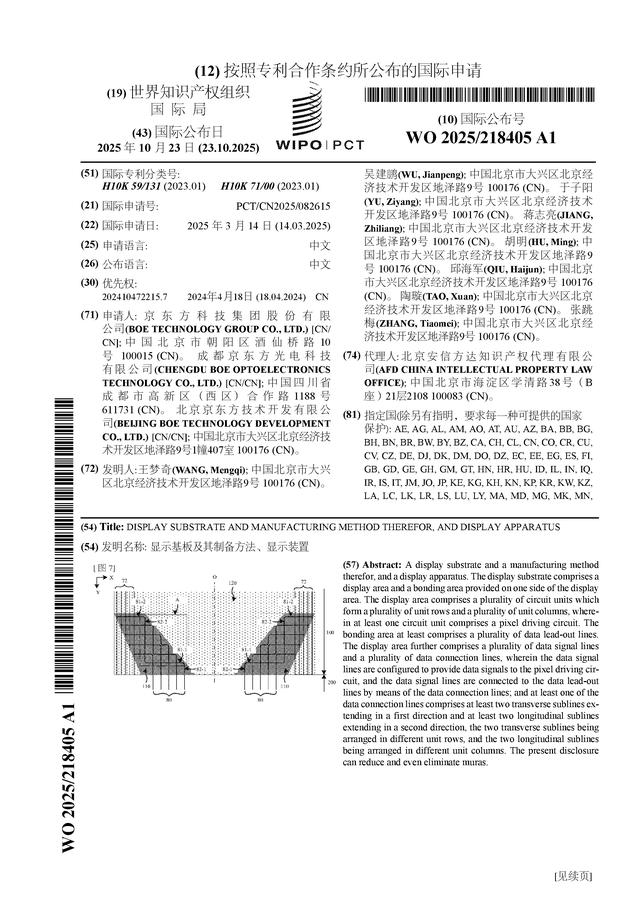 據(jù)證券之星消息,企查查數(shù)據(jù)顯示,京東方A(000725)公布了一項(xiàng)國(guó)際專利申請(qǐng),專利名稱為“顯示基板及其制備方法、顯示裝置”,專利申請(qǐng)?zhí)柺荘CT/CN2025/082615,國(guó)際公布日為2025年10月23日。