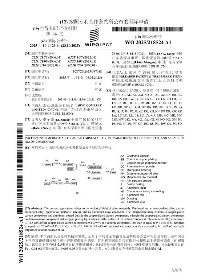 比亞迪公布“中間合金和鋁合金及其制備方法和鋁合金導(dǎo)線”國(guó)際專利申請(qǐng)