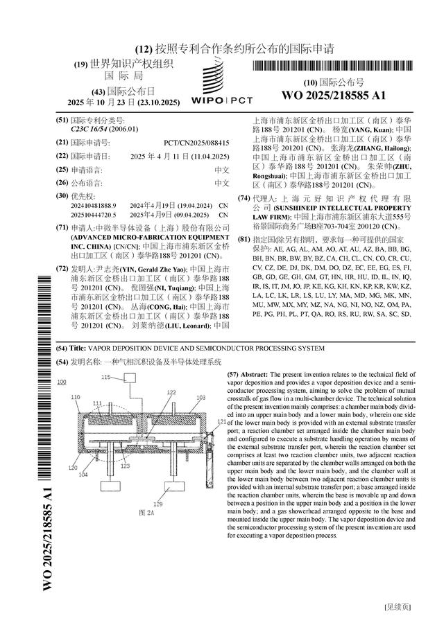 中微公司公布“一種氣相沉積設(shè)備及半導(dǎo)體處理系統(tǒng)”國(guó)際專利申請(qǐng)
