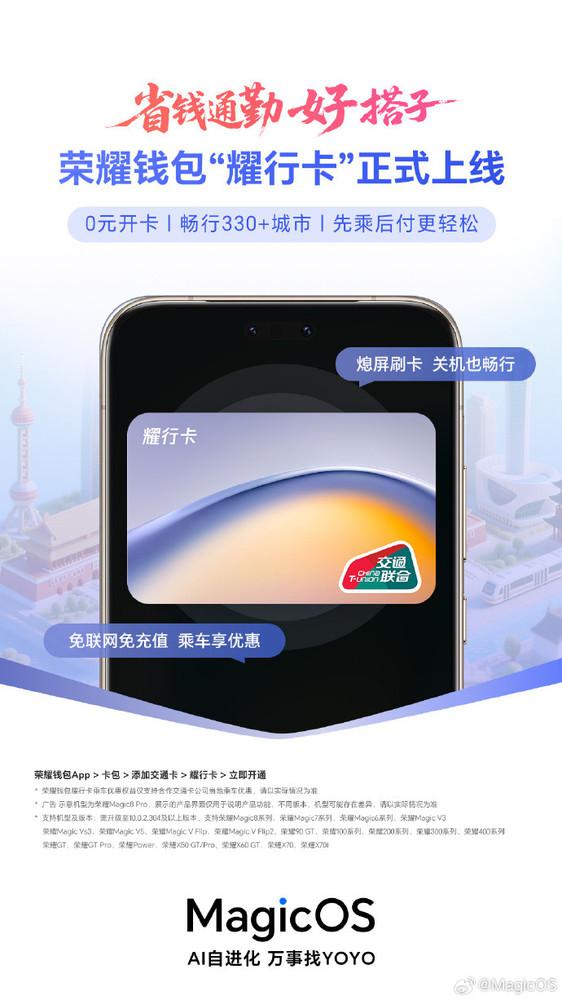 榮耀錢包“耀行卡”上線:0元開卡,先乘后付且無需聯(lián)網(wǎng)
