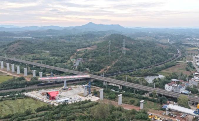 近日,在麻城市曹家坳村,滬渝蓉高鐵合武段跨京九鐵路特大66號墩T構(gòu)轉(zhuǎn)體連續(xù)梁,成功跨越既有京九鐵路,精準落在設(shè)計橋位上,順利實現(xiàn)對接。
