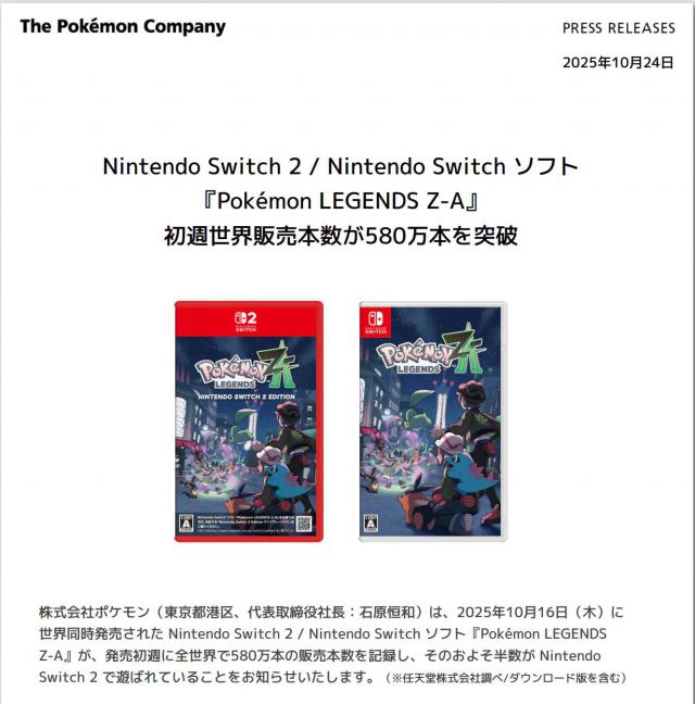 5. 《寶可夢 ZA》全球首周銷量破 580 萬