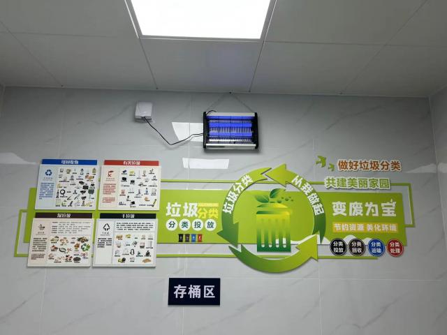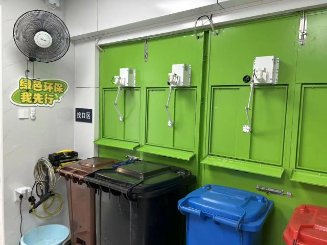 垃圾箱房內(nèi),滅蟲、除臭、節(jié)能照明裝置、排風(fēng)扇等設(shè)備應(yīng)有盡有。約二十平方米的空間能同時容納十幾個四分類垃圾桶,專門設(shè)置的工具間方便保潔人員進行清潔維護工作。