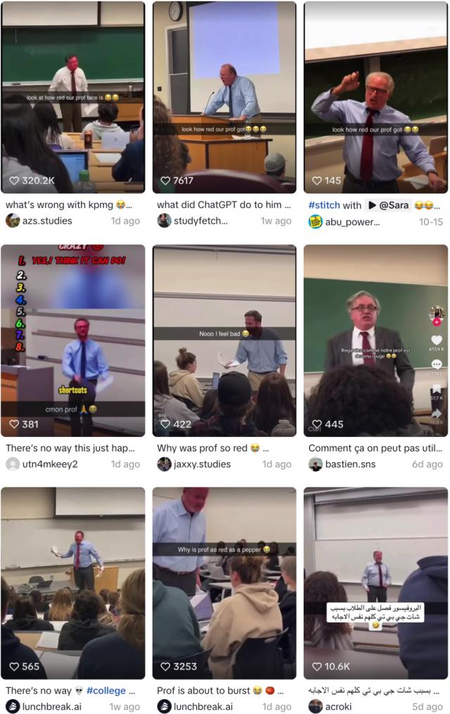 在 TikTok 上搜索“prof red chatgpt”,會發(fā)現(xiàn)同主題視頻層出不窮,其中幾位教授臉紅得超出常理,可能是 AI 提示詞沒調好(也可能是故意留破綻讓人識別)。