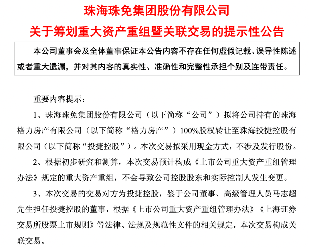 10月21日,珠免集團發(fā)布關(guān)于籌劃重大資產(chǎn)重組暨關(guān)聯(lián)交易的提示性公告,宣布擬將公司持有的珠海格力房產(chǎn)有限公司100%股權(quán)轉(zhuǎn)讓至投捷控股。本次交易擬采用現(xiàn)金方式,不涉及發(fā)行股份。