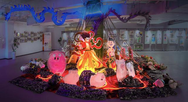 作為活動(dòng)核心,《藝塑繪夢(mèng) · 同創(chuàng)凌云》藝術(shù)展聚焦“廢棄物再生”與“代際共創(chuàng)”,匯聚了社區(qū)多元群體的環(huán)保藝術(shù)作品。大型裝置《深海龍柱》以國(guó)漫《哪吒之魔童鬧?!窞殪`感,利用展廳立柱構(gòu)建神話場(chǎng)景?;厥占埌?、雪弗板立體塑形,呈現(xiàn)青銅質(zhì)感;廢棄雪弗板雕刻出敖光、敖丙父子龍神形象;水管與紙板組合成龍身;孩子們的閑置玩具重新組合成鎖鏈鎮(zhèn)海妖的意象;廢舊報(bào)紙、紙板與低碳 LED 燈營(yíng)造出熾熱巖漿地表,讓“廢棄材料”煥發(fā)出新的藝術(shù)生命力。