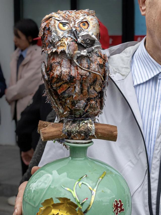 啟幕儀式上,精彩表演不斷。隴龍幼稚園的孩子們帶來活力開場(chǎng)舞,瞬間點(diǎn)燃現(xiàn)場(chǎng)氣氛。生態(tài)凌云“守藝人”志愿服務(wù)隊(duì)分組亮相:編織組與絲網(wǎng)花組用巧手制作花卉,裝點(diǎn)生活;布藝組展示了用布料創(chuàng)作的首飾與牡丹圖,融入海派文化元素,讓環(huán)保藝術(shù)更有內(nèi)涵;易拉罐組的爺叔們用廢棄易拉罐制作龍、穿山甲、貓頭鷹等擺件,部分作品還有機(jī)械裝置,活靈活現(xiàn)。