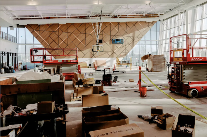 不遠處的“主場”是玻璃幕墻建筑,由穆迪·諾蘭建筑事務(wù)所設(shè)計,內(nèi)有完整籃球場、健身空間,可作大型活動場地。