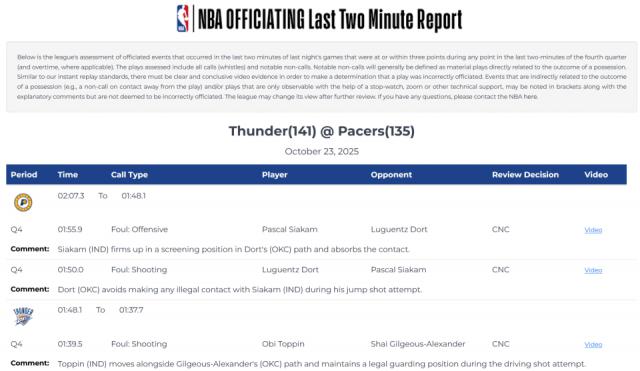 今日早些時(shí)候,NBA官網(wǎng)公布了雷霆與步行者昨日比賽第四節(jié)最后兩分鐘以及加時(shí)的裁判報(bào)告。報(bào)告顯示,列出的22個(gè)回合判罰均正確,不存在錯(cuò)判漏判情況。