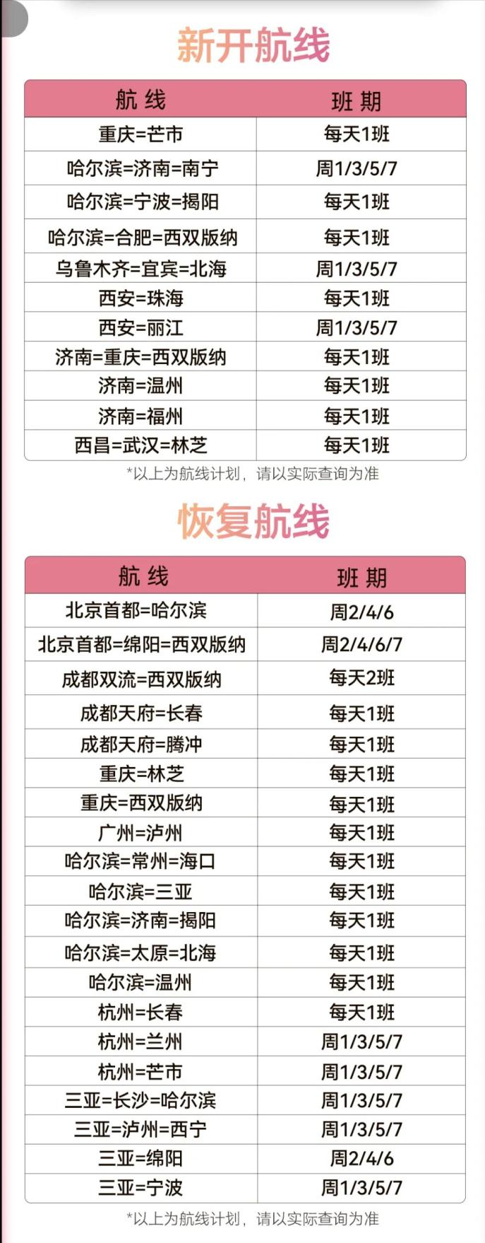 在換季首日,川航會新開重慶=芒市、西安=珠海、濟南=溫州、濟南=福州、濟南=重慶=西雙版納、哈爾濱=濟南=南寧等航線。
