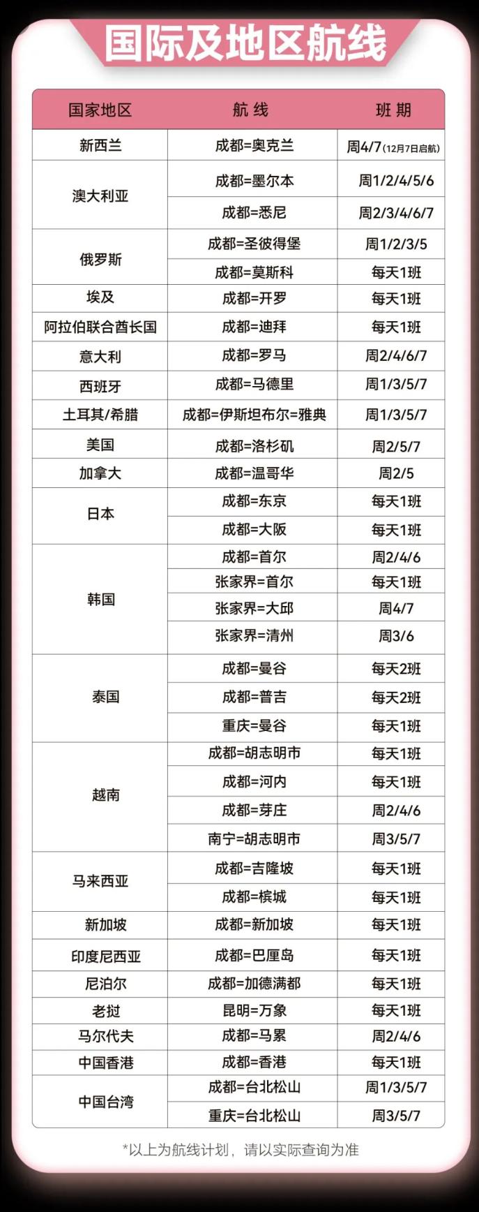 川航的國際及地區(qū)航班計劃也已確定,將執(zhí)飛32條國際航線和3條港臺地區(qū)航線。其中,成都=奧克蘭直飛航線計劃于12月7日恢復。