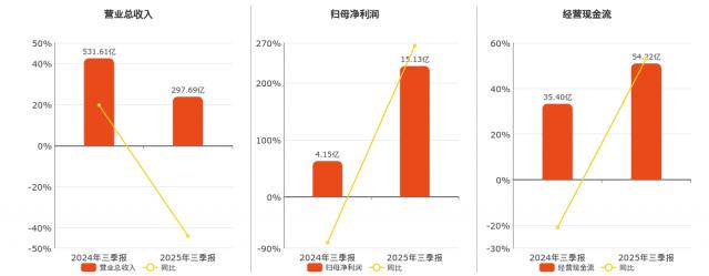 公司營業(yè)總收入為297.69億元,相較于去年同報(bào)告期減少了233.92億元,同比下降44.00%。歸母凈利潤為15.13億元,經(jīng)營活動(dòng)現(xiàn)金凈流入為54.22億元。
