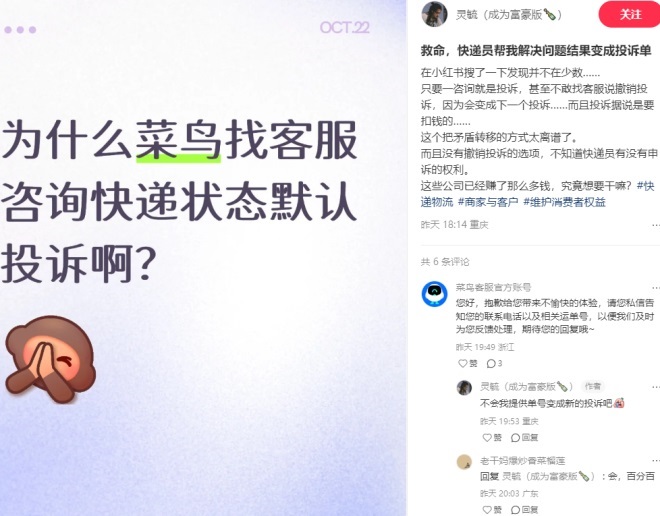 2025年10月22日,網(wǎng)友靈毓(成為富豪版)在小紅書(shū)寫道:“只要一咨詢就是投訴,甚至不敢找客服說(shuō)撤銷投訴,因?yàn)闀?huì)變成下一個(gè)投訴,而且據(jù)說(shuō)投訴是要扣錢的,另外沒(méi)有撤銷投訴的選項(xiàng),不知道快遞小哥有沒(méi)有申訴的權(quán)利?!?/p>