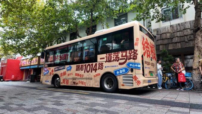 1014路公交車身以復(fù)古拼貼風(fēng)為基調(diào),展示了“軋鬧猛”“洋翻”“結(jié)棍”等杭州話高頻詞匯,還融入了沿線的??迪?、李博士橋、羊壩頭等站名。