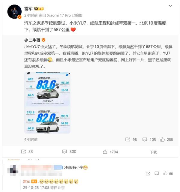 快科技10月25日消息,小米創(chuàng)辦人雷軍轉(zhuǎn)發(fā)了汽車之家的準(zhǔn)冬測數(shù)據(jù)。數(shù)據(jù)顯示,小米YU7在續(xù)航方面表現(xiàn)出色,續(xù)航里程和達成率均位列第一。其續(xù)航達到了687公里,續(xù)航達成率為83.6%,超越了競品特斯拉Model Y,不過特斯拉Model Y的能耗更低。評論區(qū)有網(wǎng)友詢問:有沒有小字。雷軍回復(fù)了8個“doge”表情包。
