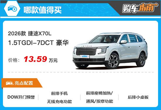 綜合來(lái)看,購(gòu)買捷途X70L時(shí),重點(diǎn)推薦1.5TGDI - 7DCT豪華版,消費(fèi)者可優(yōu)先考慮。