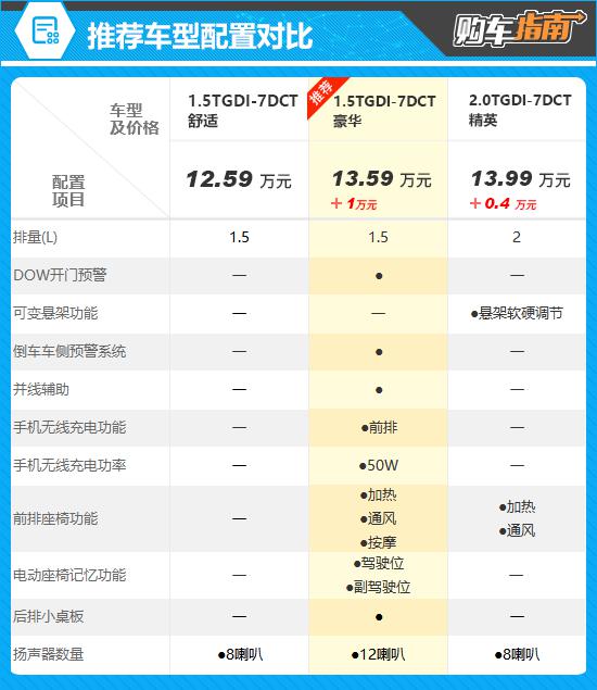 在全系車型中,特別推薦1.5TGDI - 7DCT豪華車型,指導(dǎo)價(jià)13.59萬(wàn)元。與低一級(jí)別車型相比,推薦車型配備DOW開門預(yù)警、倒車車側(cè)預(yù)警系統(tǒng)、并線輔助功能,行車安全表現(xiàn)更好,輔助駕駛能力更出色。同時(shí),還增加了前排座椅加熱/通風(fēng)/按摩、主/副駕駛位電動(dòng)座椅記憶功能、后排小桌板,揚(yáng)聲器數(shù)量增至12喇叭,乘坐舒適性和娛樂(lè)體驗(yàn)感大幅提升。而購(gòu)車成本僅增加1萬(wàn)元,性價(jià)比很高。