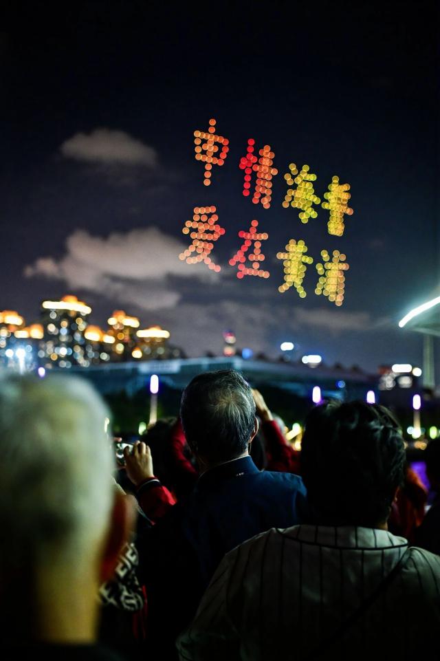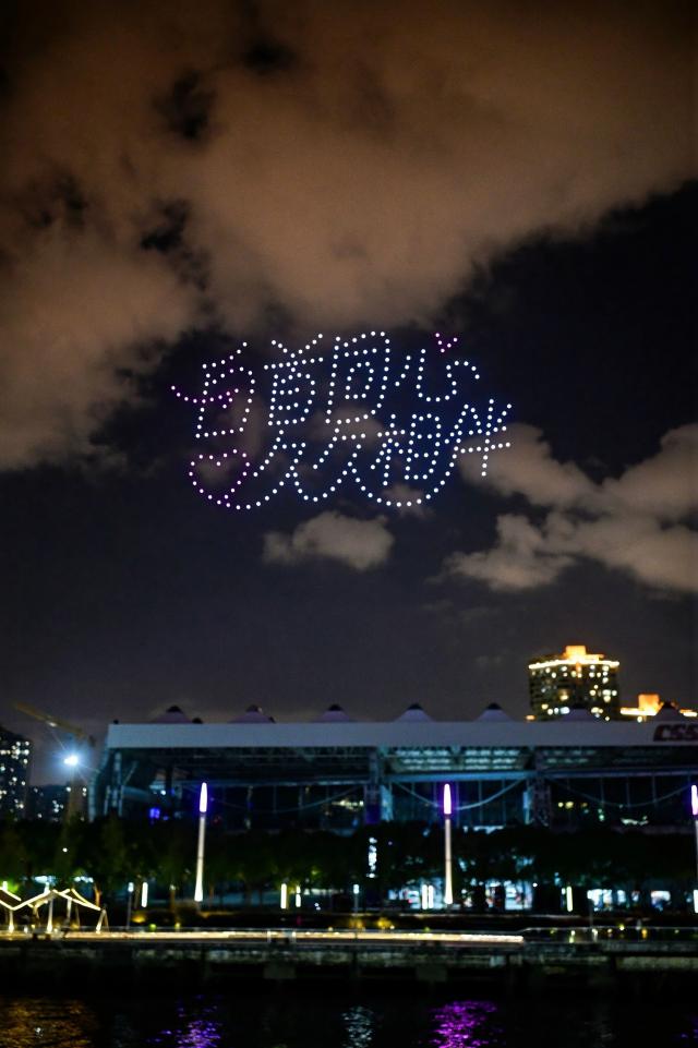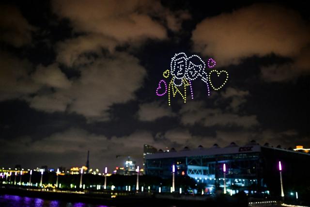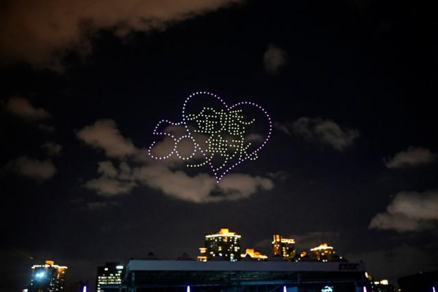 夜色漸深,金婚夫婦與新人攜手登上游輪甲板,數(shù)百架無人機(jī)在夜空次第變幻。“樂齡金婚?幸福記”的活動主題字樣在夜空亮起,隨后愛心圖案在暮色里緩緩舒展,鎏金“50”字樣緊接著浮現(xiàn),映亮江面,大紅雙喜造型橫跨夜空。流動的光影與粼粼江波交相輝映,載著黃浦江畔獨(dú)有的浪漫與溫情。