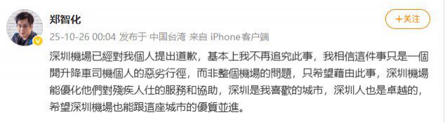 隨后,鄭智化作出回應(yīng),稱深圳機場已向他個人道歉,他不再追究此事。他認(rèn)為這只是開升降車司機個人的惡劣行為,并非整個機場的問題,只希望通過這件事,深圳機場能夠優(yōu)化對殘疾人士的服務(wù)和協(xié)助。