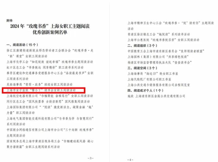 “警小丫”讀書會(huì)女職工閱讀活動(dòng)憑借 “主業(yè)、方法、實(shí)踐三融合”特色模式,榮獲2024年“玫瑰書香”上海女職工主題閱讀優(yōu)秀創(chuàng)新案例。