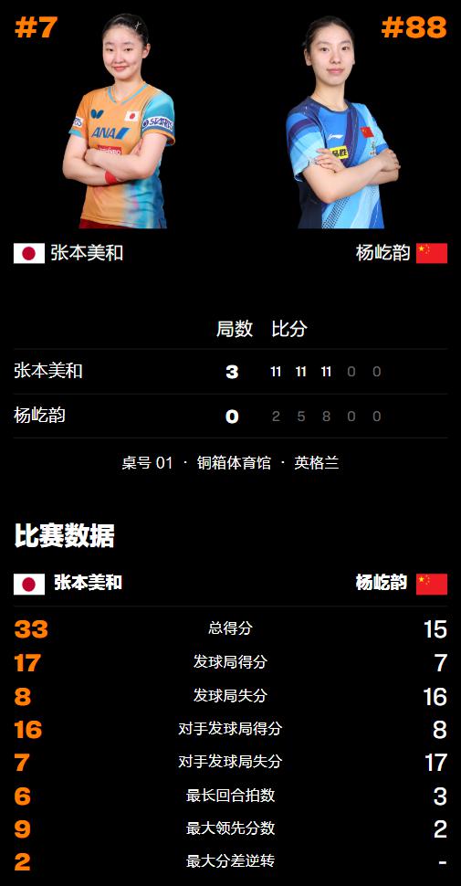 張本美和是女單的頭號(hào)種子,上一輪她險(xiǎn)些出局,兩度落后,最終3 - 2逆轉(zhuǎn)世界冠軍隊(duì)友平野美宇。此前她與楊屹韻唯一一次交手,3 - 0輕松獲勝,所以這場(chǎng)比賽國(guó)乒壓力更大。