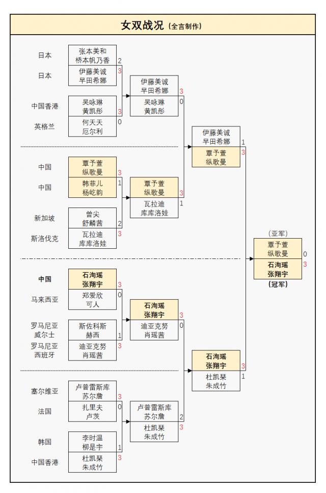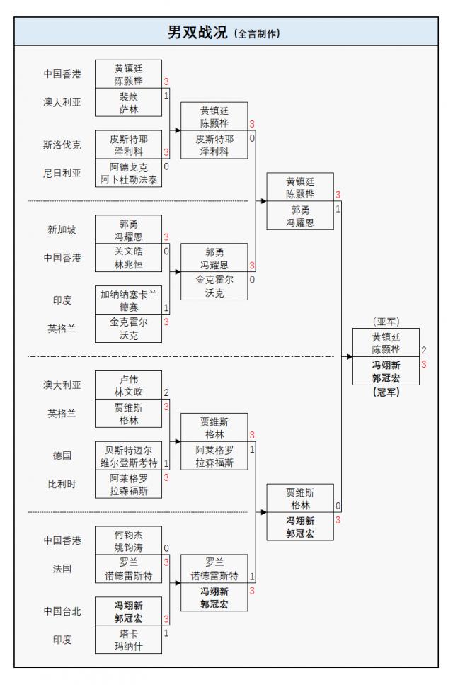 另外兩項(xiàng)雙打的決賽均在中國運(yùn)動(dòng)員之間進(jìn)行。男雙比賽中,馮翊新 / 郭冠宏(中國臺(tái)北)打滿5局,3 - 2險(xiǎn)勝近期成績(jī)不俗的黃鎮(zhèn)廷 / 陳顥樺(中國香港)奪冠?;祀p決賽尚未開打,奧運(yùn)會(huì)季軍組合林昀儒 / 鄭怡靜(中國臺(tái)北)將與世乒賽季軍配對(duì)黃鎮(zhèn)廷 / 杜凱琹(中國香港)展開對(duì)決。