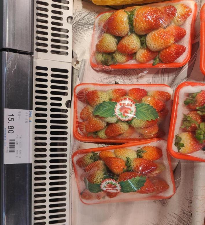 10月25日,成都市金牛區(qū)萬達(dá)廣場超市貨架上的二十多盒草莓吸引了不少市民。文女士拿起一盒查看后放回,“一盒半斤左右,賣15塊8,合32元一斤,還沒全紅,等大量上市再買?!庇浾呖吹剑缓屑s20顆草莓,靠近果梗部分未全紅,標(biāo)注“產(chǎn)地:成都”。實(shí)際上,當(dāng)前成都極少數(shù)早熟草莓已成熟。