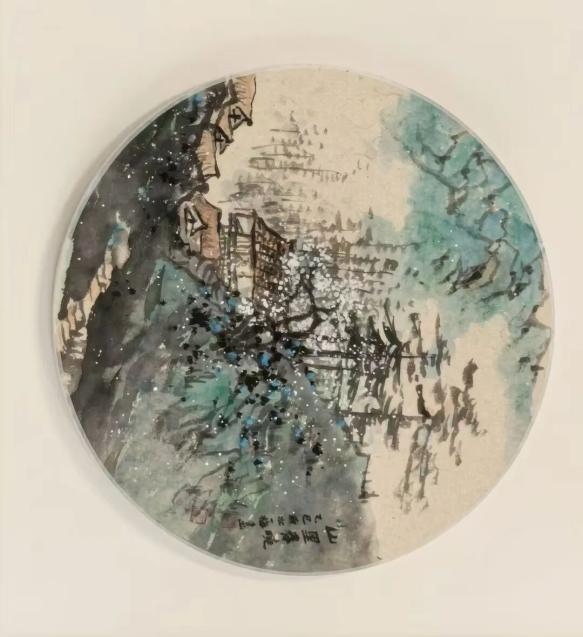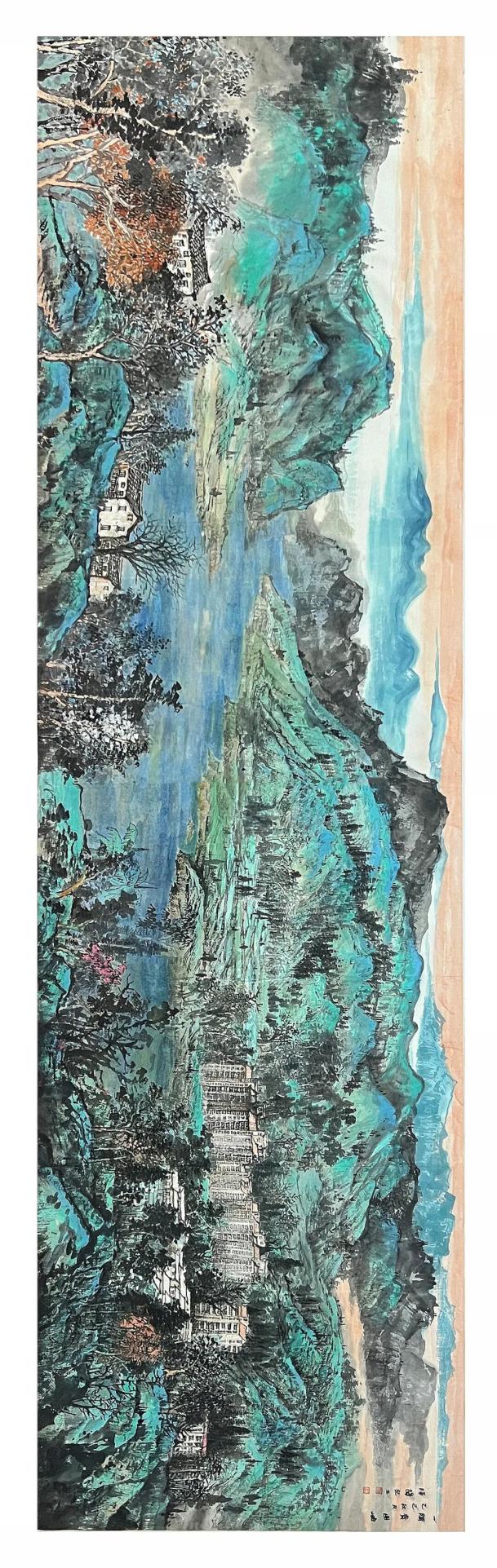 畫(huà)作以青山綠水為骨架,描繪出閩西監(jiān)獄七十年的精神畫(huà)卷。左側(cè)錯(cuò)落的板房,湖畔如鏡的良田,再現(xiàn)了1955年龍巖青草盂勞改農(nóng)場(chǎng)的拓荒景象。右側(cè)青山間整齊的監(jiān)房和安靜的民警小區(qū),展現(xiàn)了新時(shí)代監(jiān)獄的清朗面貌。群峰默默守護(hù)著歲月,碧波蕩漾彰顯著擔(dān)當(dāng),筆墨揮灑間,七十年的歲月化作山水的筋骨,在青綠的皴染中愈發(fā)深沉厚重。