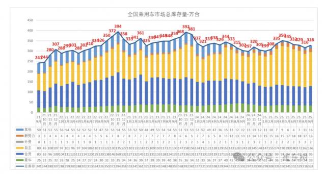 IT之家10月26日消息,乘聯(lián)分會崔東樹發(fā)文透露,2025年9月(上月)末全國乘用車行業(yè)庫存達328萬輛,較上月增加12萬輛,較2024年9月增加26萬輛,呈現(xiàn)出庫存回升的旺季備貨特征。