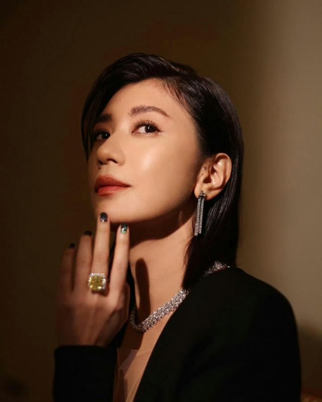 在淺色背景前,賈靜雯斜倚著墻面,短發(fā)紅唇搭配深V開衩長裙,舉手投足間盡顯成熟韻味。她佩戴的同系列鉆石項(xiàng)鏈、手鐲和耳墜價(jià)值不菲,但她卻演繹出了一種舉重若輕的從容。這種“人駕馭珠寶”的能力,源于她多年沉淀下來的自信氣場。