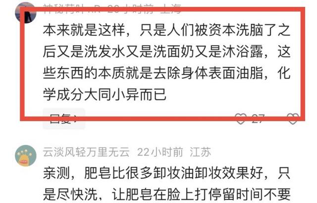 也有網(wǎng)友認(rèn)為,人們是被資本洗腦了,洗發(fā)水、洗面奶、沐浴露沒(méi)必要分得那么清楚。