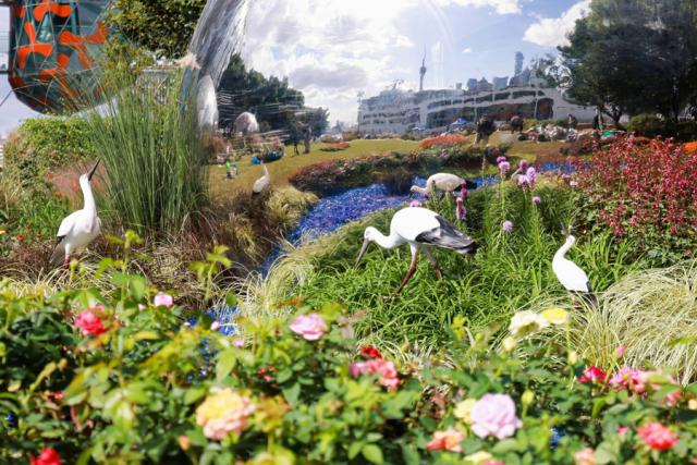 作品選用了大量應(yīng)用在杭州高架上的網(wǎng)紅“西子系列”月季,團(tuán)隊通過花期調(diào)控技術(shù),確保月季在花展期間集中盛放,呈現(xiàn)最佳觀賞效果。同時搭配狼尾草、粉黛亂子草等觀賞草,其隨風(fēng)搖曳的姿態(tài)能更好地呼應(yīng)黃浦江江景,增添自然野趣。