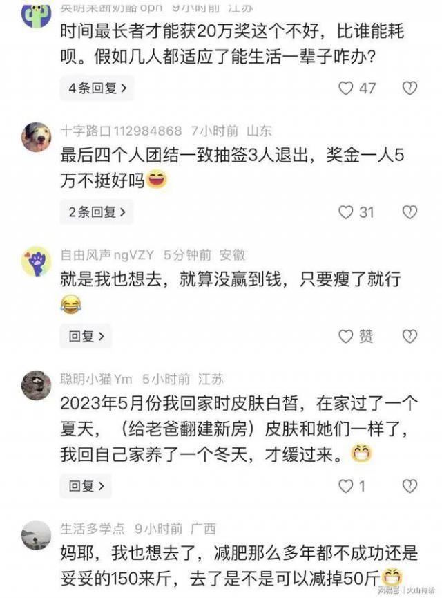 針對此次挑戰(zhàn),網(wǎng)友看法不一。有人覺得以堅(jiān)持時(shí)間最長者獲得 20 萬獎(jiǎng)金的規(guī)則不好,質(zhì)疑“比誰能耗,假如幾人都適應(yīng)了能生活一輩子咋辦”。還有網(wǎng)友提出,最后四個(gè)人團(tuán)結(jié)一致抽簽,3 人退出,獎(jiǎng)金一人 5 萬也不錯(cuò)。