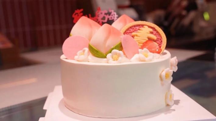 記者看到,壽桃蛋糕造型獨特,表面用巧克力做出了栩栩如生的壽桃,蛋糕上大大的“壽”字,以及周圍點綴的花朵圖案和“福如東海、壽比南山”字樣,都飽含著美好的寓意。