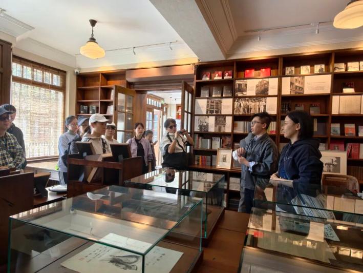 為了確保聽障人士能清晰獲取歷史信息,活動全程由街道市民驛站協(xié)調(diào)高級手語翻譯寇辰珠提供同步翻譯服務(wù)。在1927?魯迅與內(nèi)山紀念書局,經(jīng)過精心改造的場景吸引了參與者的目光。講解員介紹,書局依據(jù)老照片復原了大部分場景,書架布局和燈光效果都再現(xiàn)了百年前的風貌?,F(xiàn)場展示著魯迅翻譯的拜倫、莎士比亞著作,以及馬克思、恩格斯等左翼文化人士推崇的原版書籍。特別的是,書局內(nèi)魯迅曾用于會客的四把藤椅中,有一把是專門為適配他的身材定制的,尺寸略小于其他三把,這一細節(jié)引得聽障人士紛紛駐足觀察。此外,講解員還分享了書局與魯迅的故事,比如以店員名義代租拉摩斯公寓、大陸新村兩處居所保障其安全,中轉(zhuǎn)手稿與書信規(guī)避出版限制等史實。