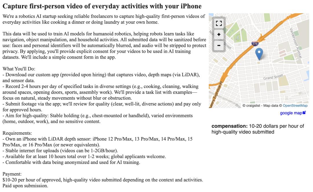 甚至有某機(jī)器人初創(chuàng)公司自己在Craigslist發(fā)廣告,以10–20美元時(shí)薪征集用戶用手機(jī)拍攝家務(wù)的視頻。