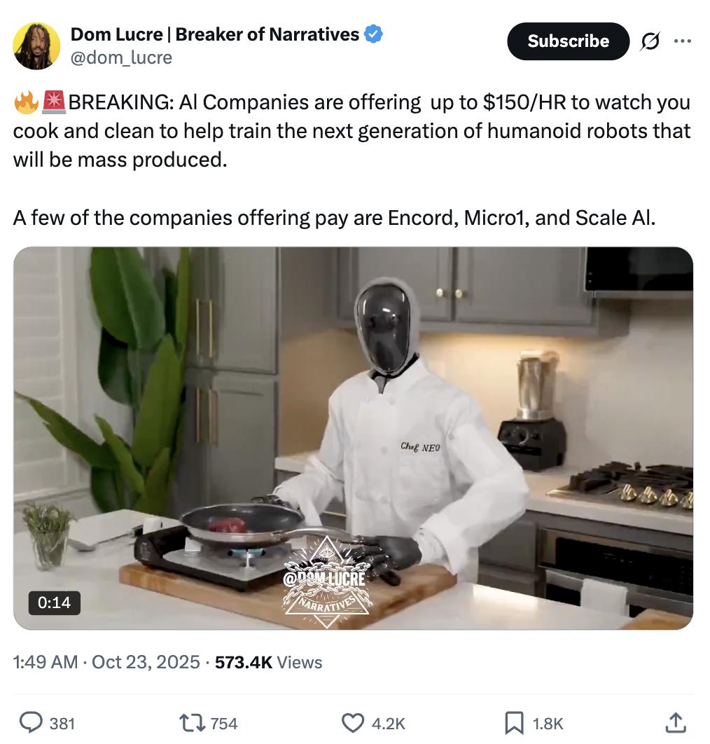 沒錯(cuò),這年頭,你做家務(wù)的視頻正被Encord、Micro1、Scale AI這些數(shù)據(jù)標(biāo)注服務(wù)商當(dāng)作訓(xùn)練人形機(jī)器人的人類高等素材,高價(jià)回收。