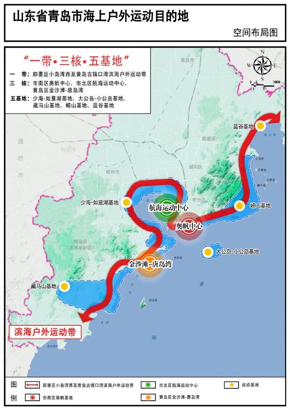 打造“一帶三核五基地”的戶外運動空間布局。依托東起鰲山灣、西至古鎮(zhèn)口灣的黃金海岸線,打造活力濱海運動帶;重點發(fā)展奧帆中心、航海運動中心和金沙灘 - 唐島灣區(qū)域三大海洋賽事活動核心;推進藍谷、嶗山、少海 - 如意湖、大公島 - 小公島和藏馬山地區(qū)五處時尚戶外運動基地建設(shè),形成層次分明、功能互補的運動格局。