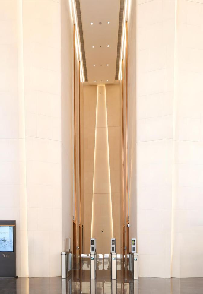 一樓大堂高約14米,呈現(xiàn)出抽象化的山谷形態(tài),給人一種恢弘高曠的氣勢;進口原石墻面,有著凹凸起伏的質感;樹狀立柱、弧形立面獨具流暢的線性美感。5層至23層的辦公空間,按照國家甲級寫字樓標準打造,單層凈高近2米,四周配有通高巨幕玻璃,可360度俯瞰大廈周邊的街景;部分樓層的樓板可拆卸,能夠擴層空間,搭建LOFT式辦公空間;5層還設有兩個景觀大露臺。