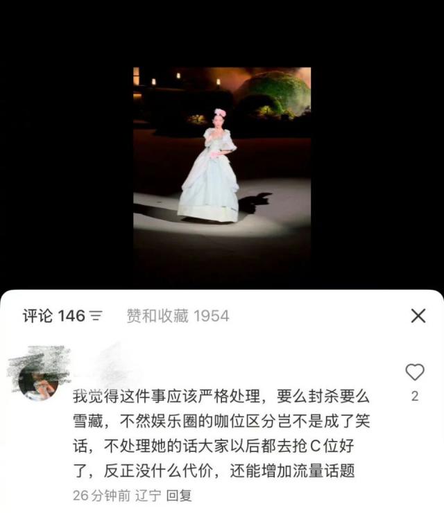 有網(wǎng)友稱:“我覺得這件事應(yīng)該嚴(yán)格處理,要么封殺要么雪藏,不然娛樂圈的咖位區(qū)分豈不是成了笑話,不處理她的話大家以后都去搶C位了,反正沒什么代價(jià),還能增加流量話題?!?/p>