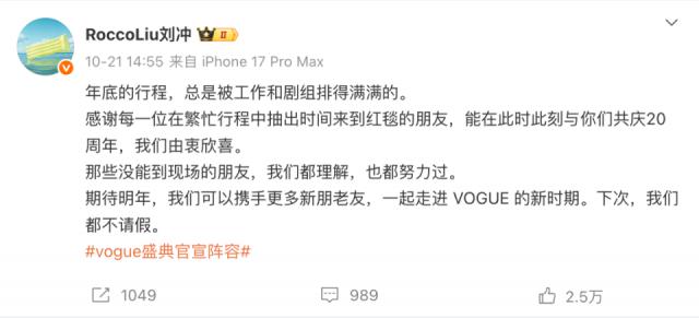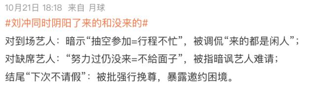 雜志官宣嘉賓后,讓人傻眼,網(wǎng)傳名單近一半人沒來,大花一個(gè)沒到,熱門電影生都沒出席,流量小花也很少。引發(fā)爭(zhēng)議后,主編劉沖發(fā)微博,內(nèi)容被網(wǎng)友解讀為“同時(shí)陰陽了來的和沒來的”。