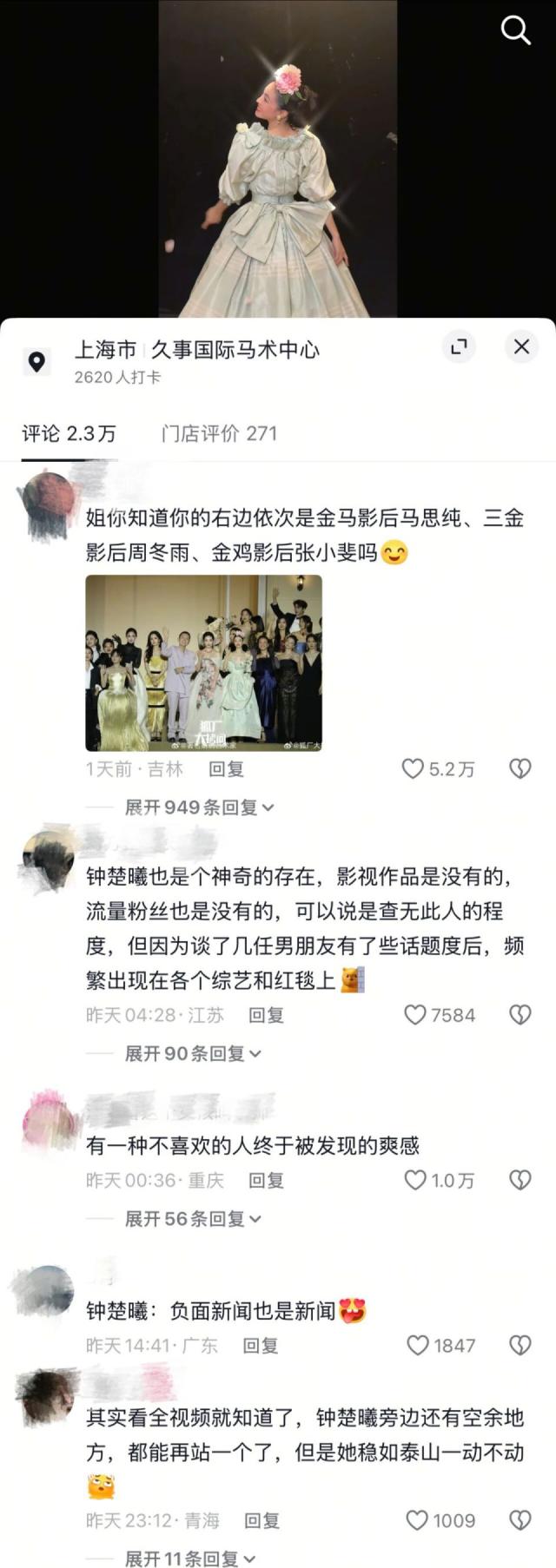 隨著熱度發(fā)酵,鐘楚曦路人緣急轉(zhuǎn)直下,被罵“鐘杵C”。她個(gè)人社交賬號(hào)評(píng)論區(qū)滿是吐槽,有網(wǎng)友說她“沒作品,就只知道走紅毯”,還有人直言“討厭的人終于被發(fā)現(xiàn)了”。更過分的是,有人直接提出“建議封殺鐘楚曦”。