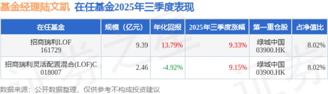 據(jù)證券之星消息,截至2025年三季度末,基金經(jīng)理陸文凱共管理2只基金。其中,招商瑞利LOF(161729)本季度表現(xiàn)最佳,季度凈值漲幅達(dá)9.33%。