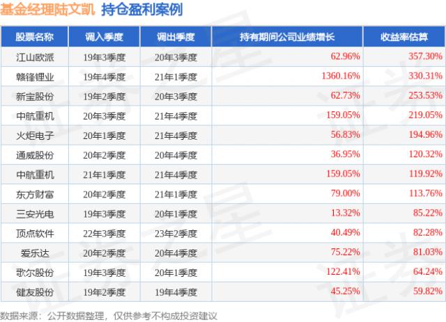 陸文凱管理的北信瑞豐產(chǎn)業(yè)升級(jí)基金于2019年3季度買入江山歐派,持有1年又0個(gè)季度后,在2020年3季度賣出。持有期間估算收益率為357.3%,2019 - 2020年年報(bào)顯示,江山歐派歸屬凈利潤(rùn)增幅達(dá)62.96%。