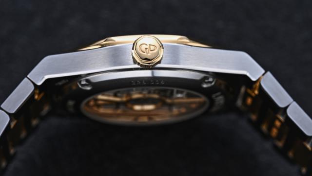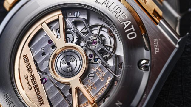 與3000系列機(jī)芯相比,全新的GP4800機(jī)芯在核心架構(gòu)和整體美學(xué)設(shè)計上顯著改進(jìn)。它基于最新技術(shù)標(biāo)準(zhǔn)打造,有硅質(zhì)擒縱機(jī)構(gòu)和無卡度游絲擺輪,擺頻每小時28800次,單發(fā)條盒動力提升至55小時。其直徑25.6毫米、厚度4.28毫米的尺寸,適配各種表殼,為小表徑表款開發(fā)預(yù)留空間,也考慮了未來復(fù)雜功能模塊適應(yīng)性。其靈感源自三金橋的對稱版路布局,擺輪上方是橋狀橫跨式擺夾板,中間夾板為上鏈機(jī)構(gòu)和傳動輪系,最后是發(fā)條盒夾板,整體結(jié)構(gòu)分工明確、氣勢恢宏。每塊鍍銠夾板飾有精美的日內(nèi)瓦條紋和鉆石斜面倒角,鐫刻有浮雕Logo的K金大擺陀更是提升了機(jī)芯的高貴指數(shù)。我們期待能盡快看到更多搭載該機(jī)芯的全新表款!