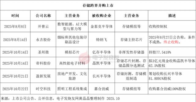 電子發(fā)燒友網(wǎng)報(bào)道(文 / 黃晶晶)2025年下半年,存儲(chǔ)芯片、封測(cè)等產(chǎn)業(yè)鏈企業(yè)的上市進(jìn)程顯著加快。不僅有跨界收購(gòu)上市的情況,還有行業(yè)巨頭進(jìn)行IPO,以及存儲(chǔ)廠商重啟IPO等。電子發(fā)燒友網(wǎng)對(duì)近期存儲(chǔ)企業(yè)相關(guān)上市動(dòng)向展開(kāi)了統(tǒng)計(jì)與分析。