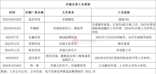 進(jìn)入2025年下半年,存儲(chǔ)廠商的IPO進(jìn)展明顯加快。例如,華瀾微于2025年9月重啟IPO,已完成輔導(dǎo)備案,計(jì)劃在A股主板上市。晶存科技轉(zhuǎn)戰(zhàn)港股IPO,于2025年9月29日正式向港交所遞交主板上市申請(qǐng)。從這些舉措可以看出,存儲(chǔ)廠商上市迎來(lái)了新的契機(jī)。